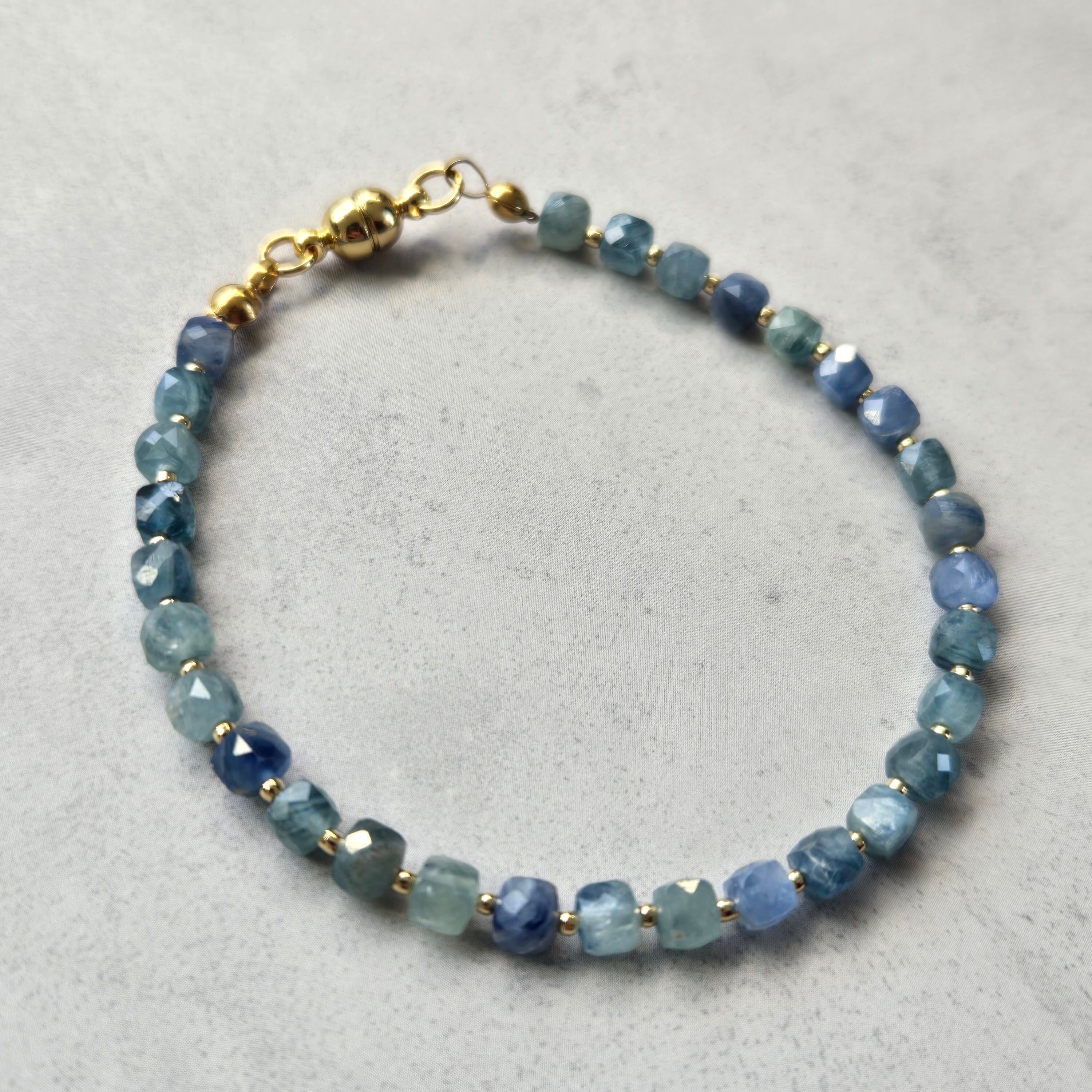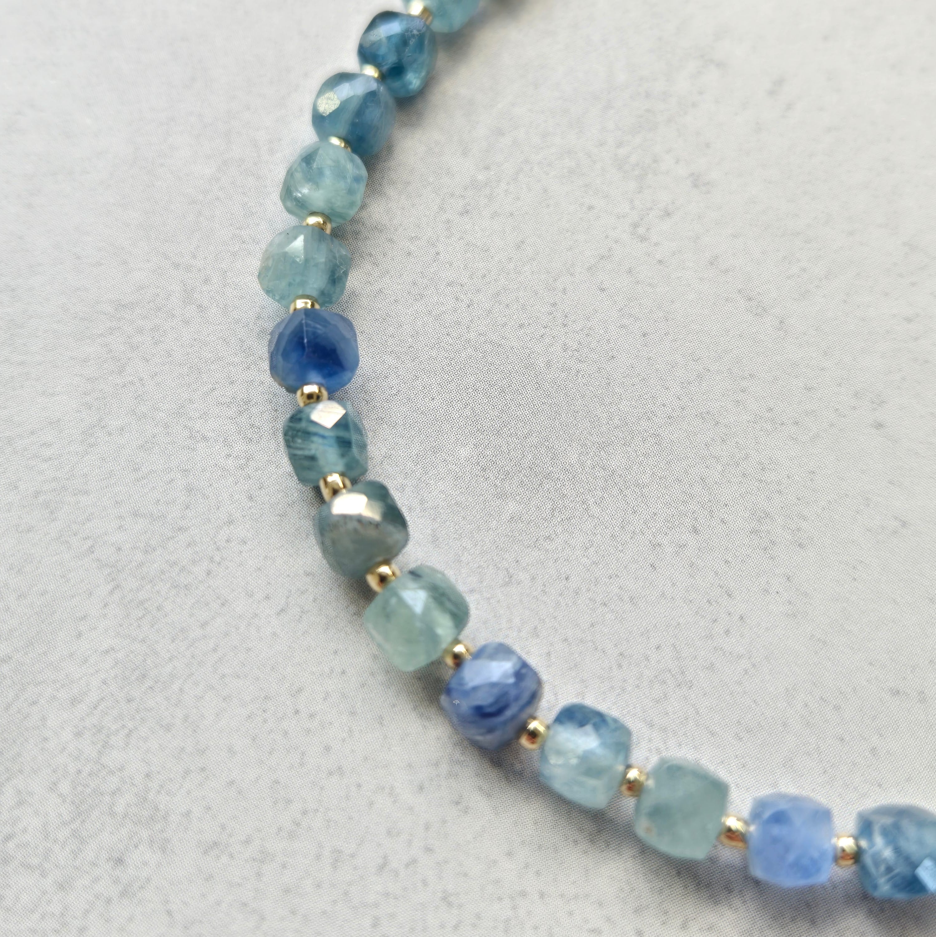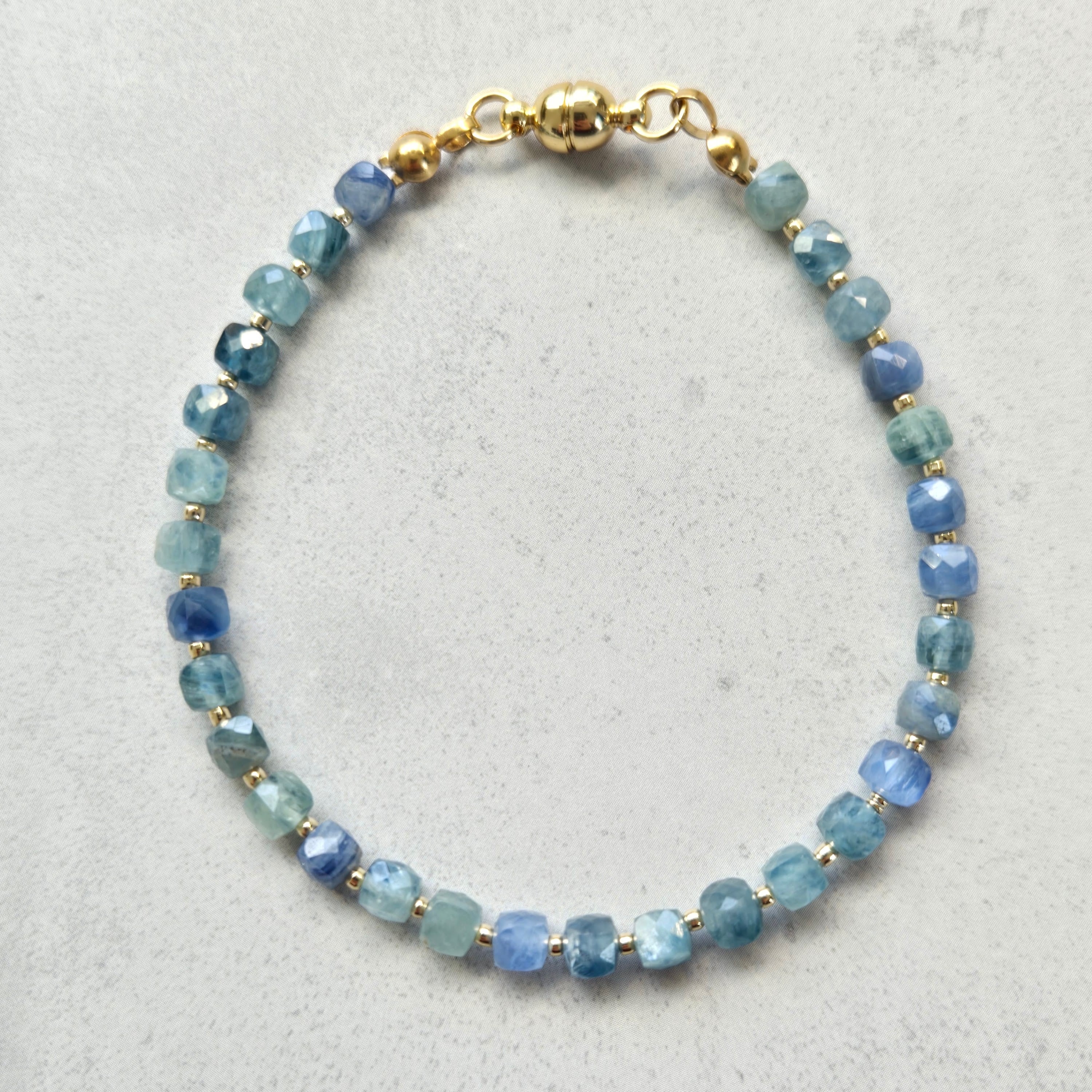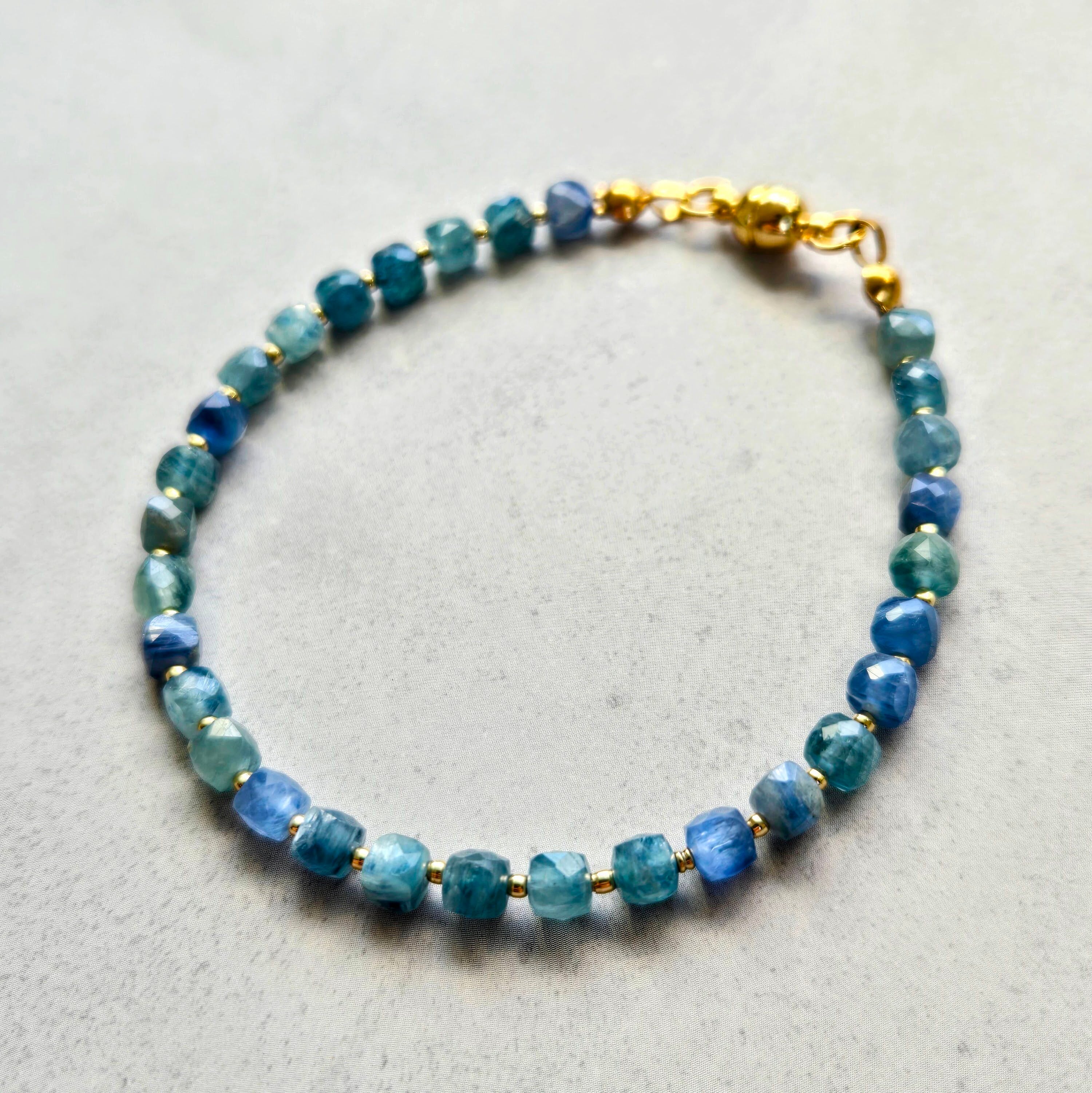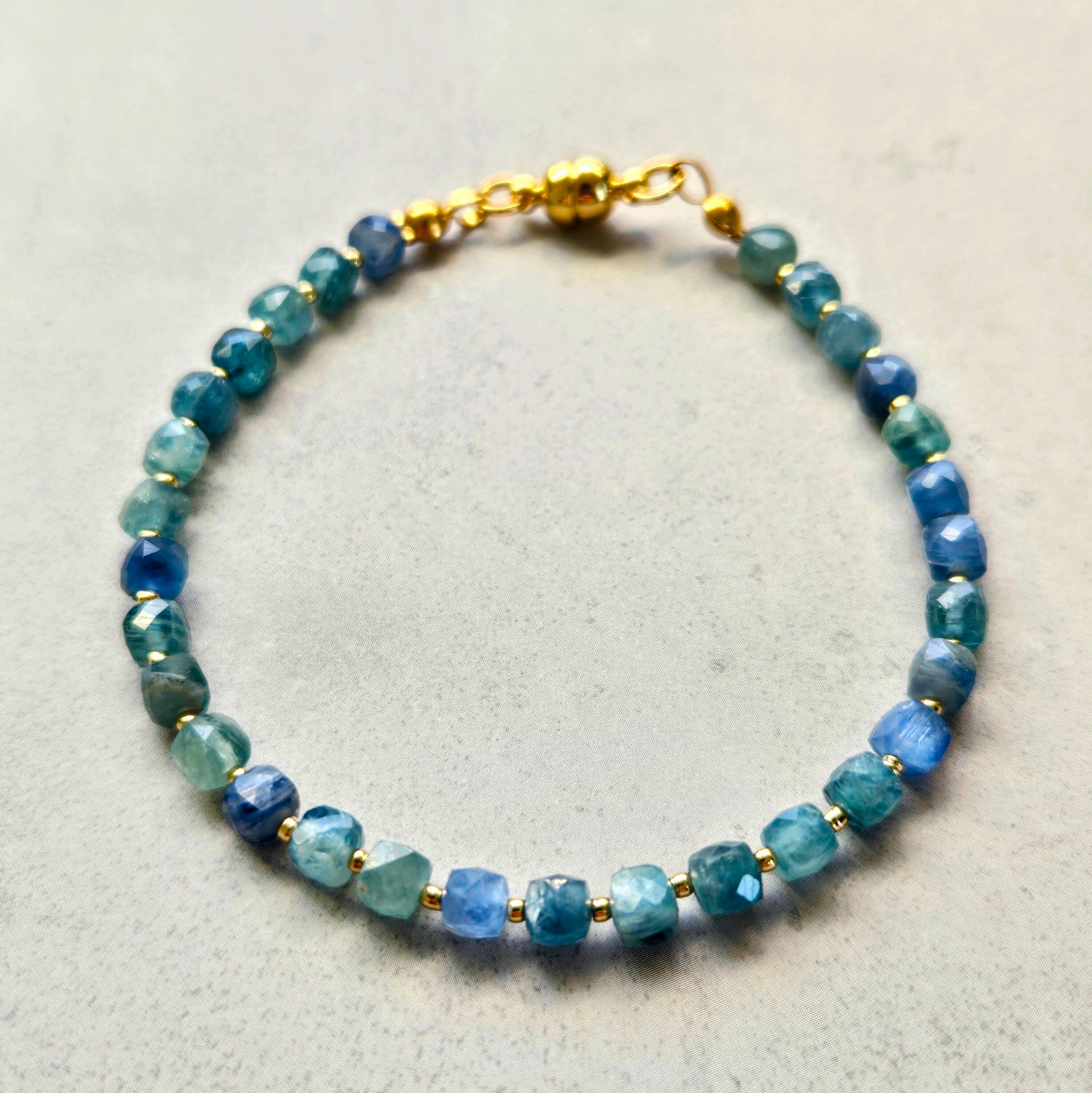 深みのあるブルーと柔らかなグリーンが交わる、マルチカラーカイヤナイトのブレスレットです。