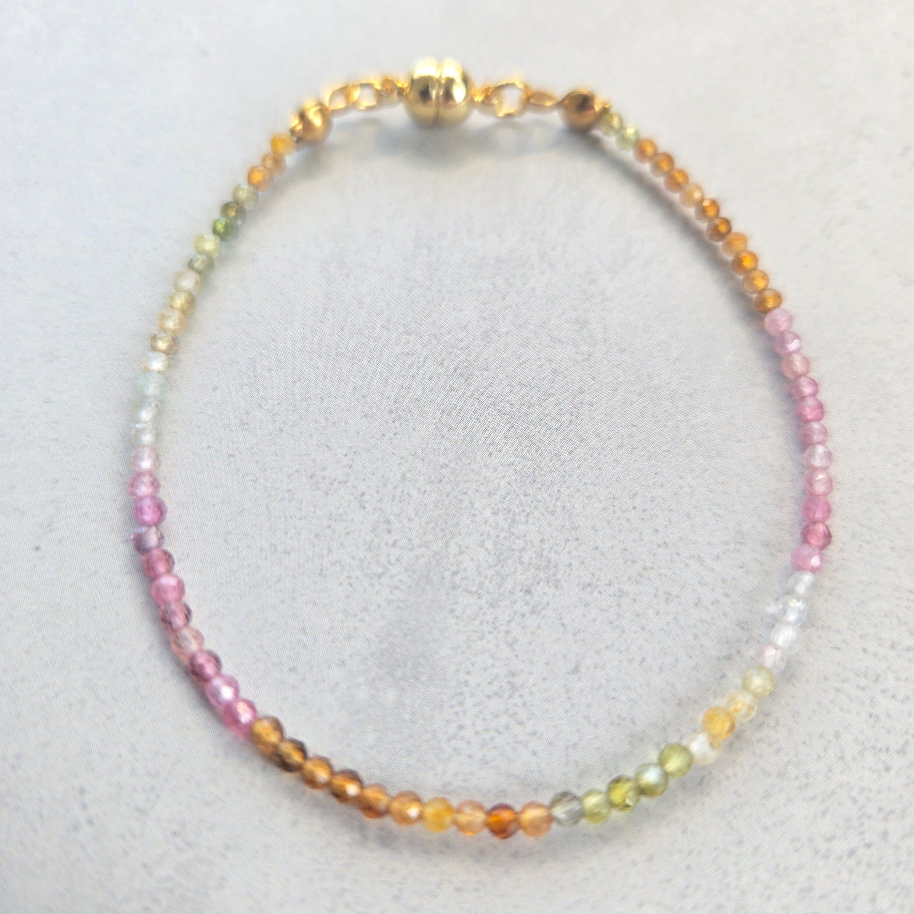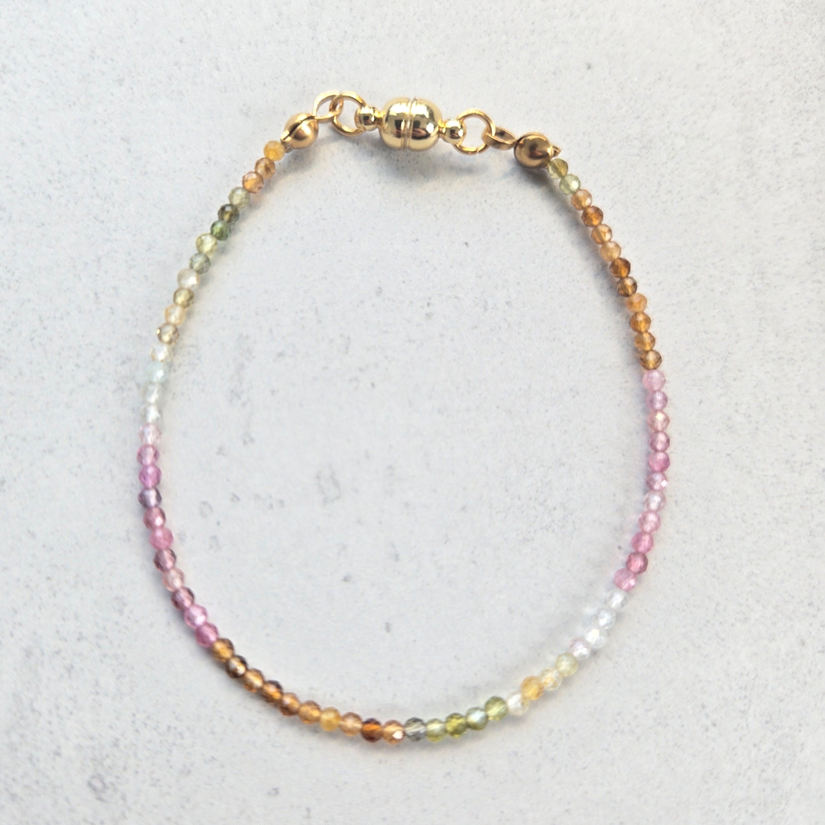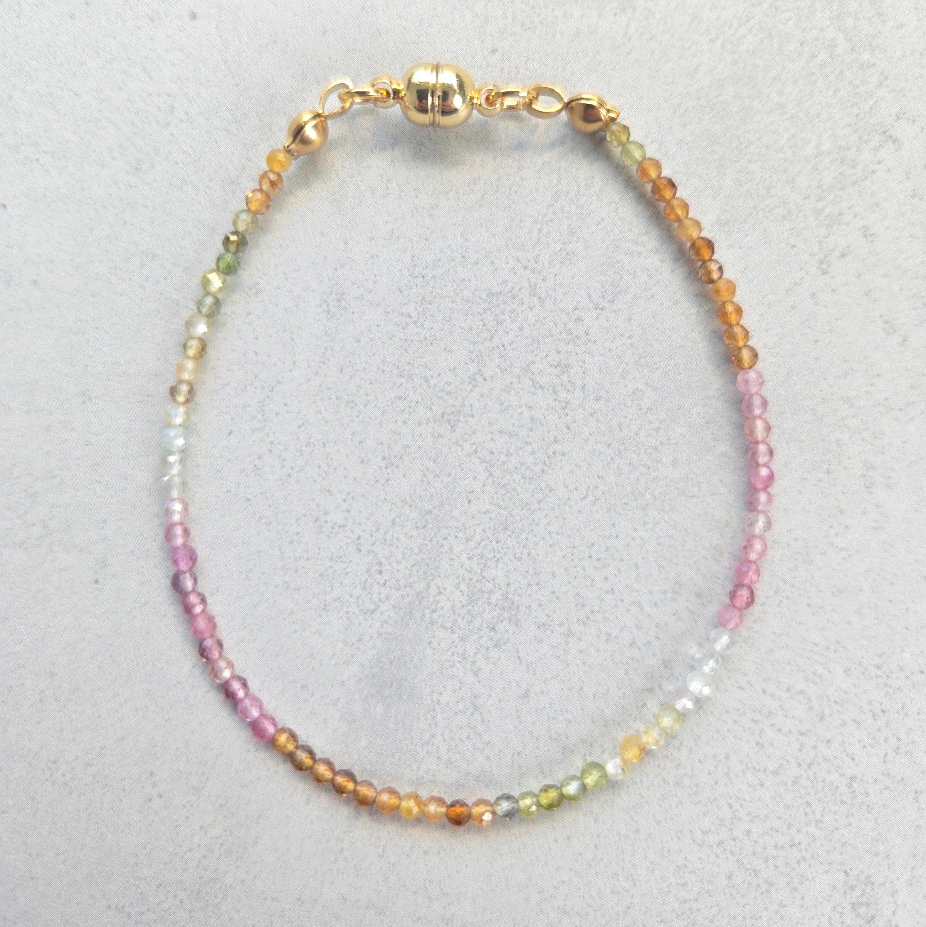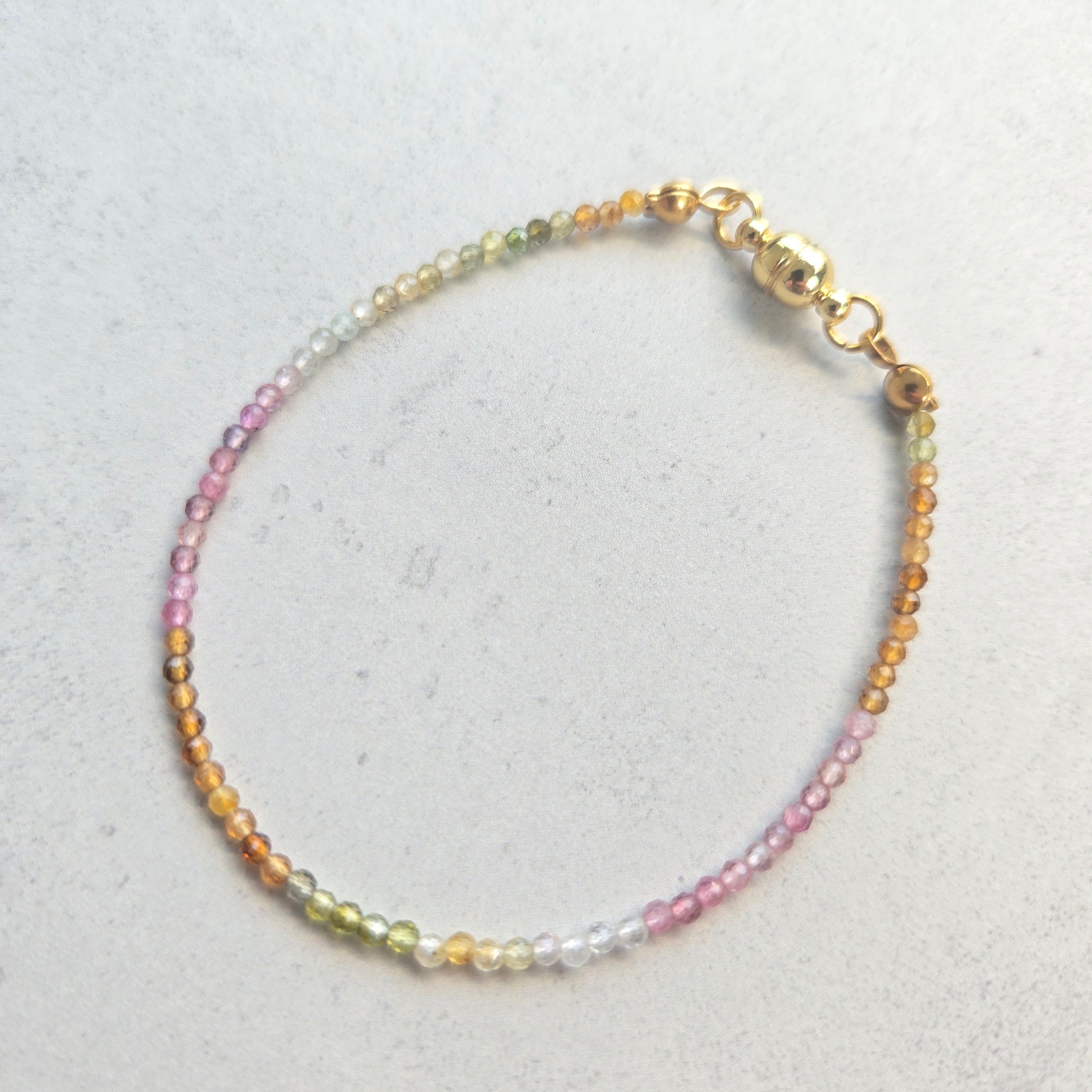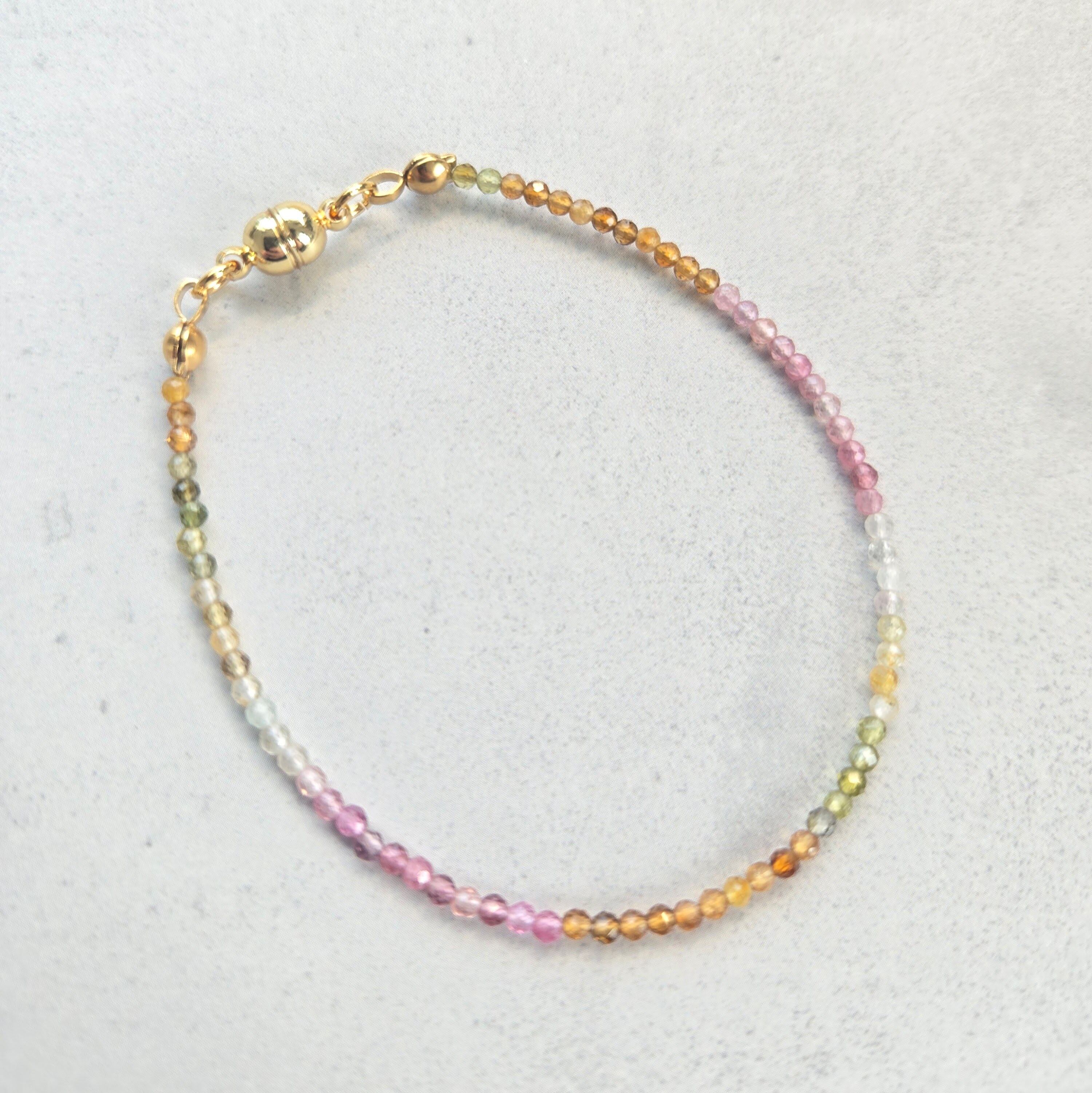 天然トルマリンならではの多彩な色合いを、極細・繊細なデザインに仕立てたブレスレットです。