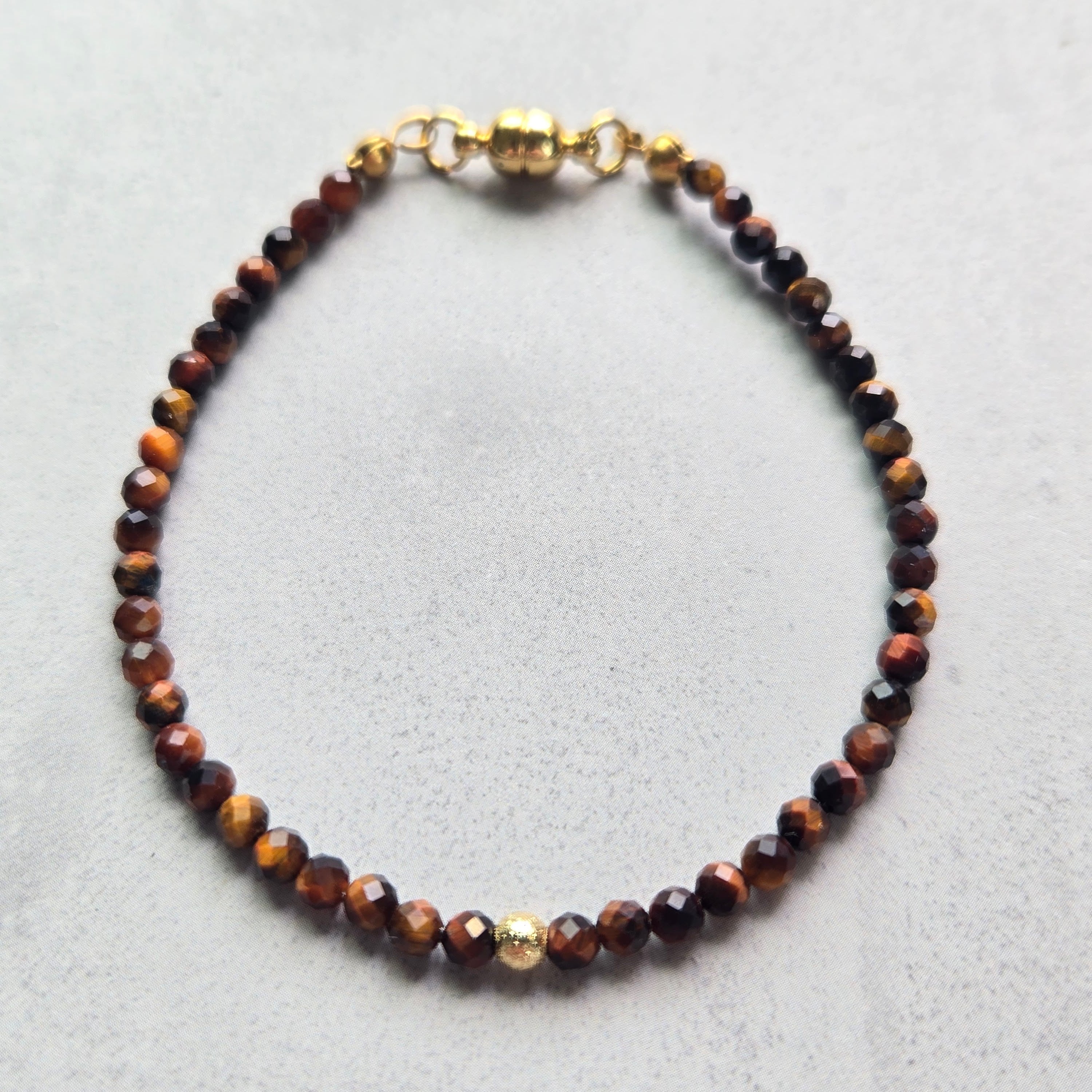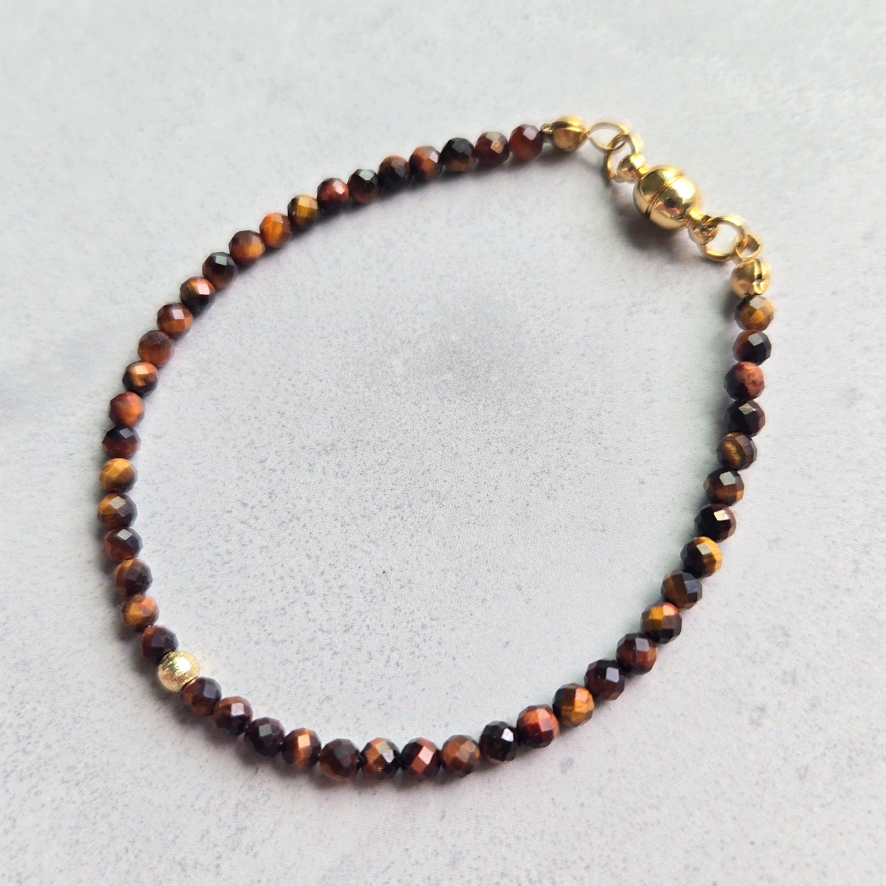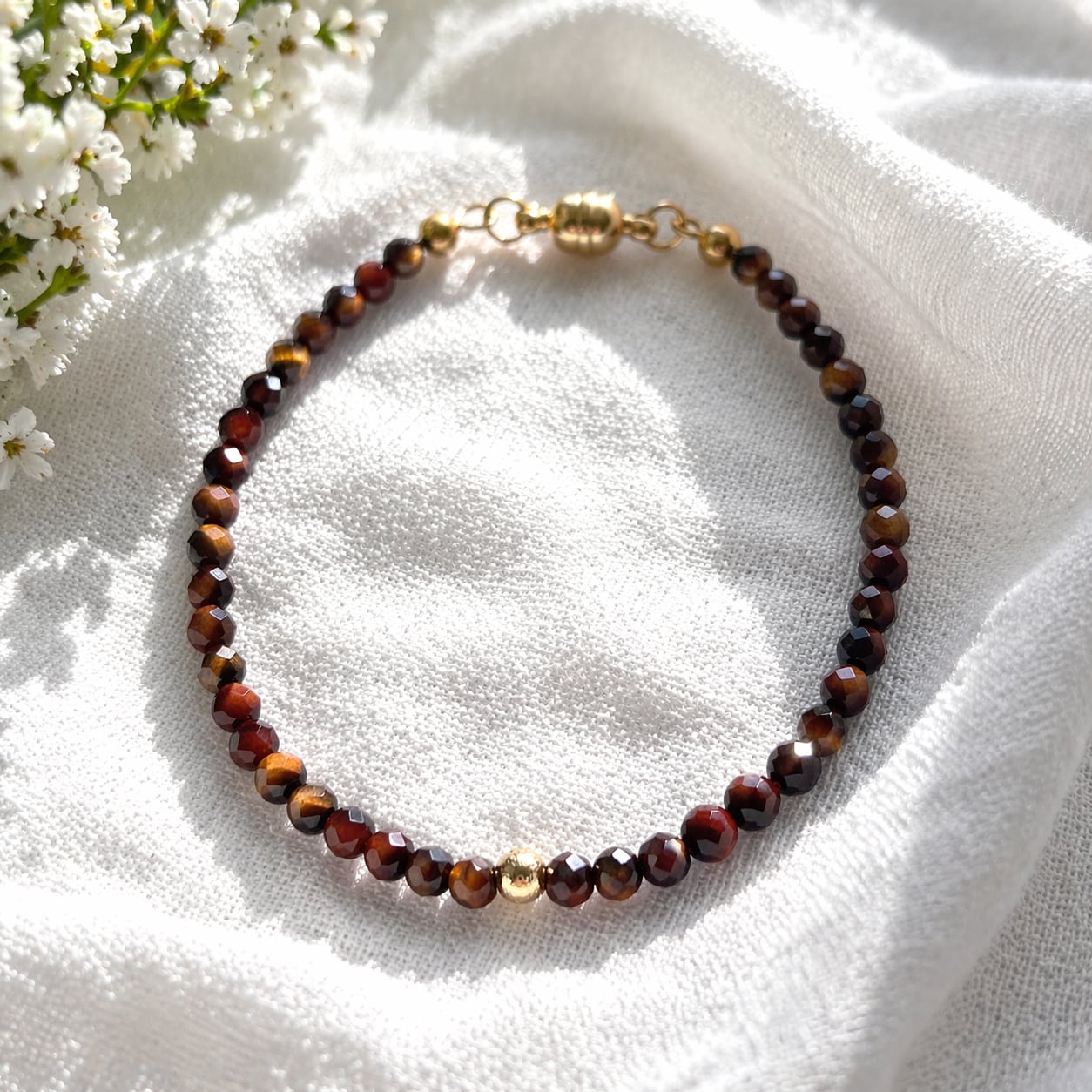 レッドタイガーアイ ブレスレット 3mm|16cm・サイズ調整可|天然石・華奢・重ね付け|金属アレルギー対応 サージカルステンレス|マグネット留め具|仕事運・行動力
